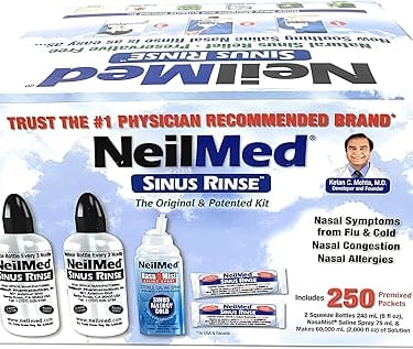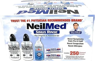 Simply empty a packet of pre-mixed saline powder into the provided plastic bottle and flush out your sinuses over the sink.